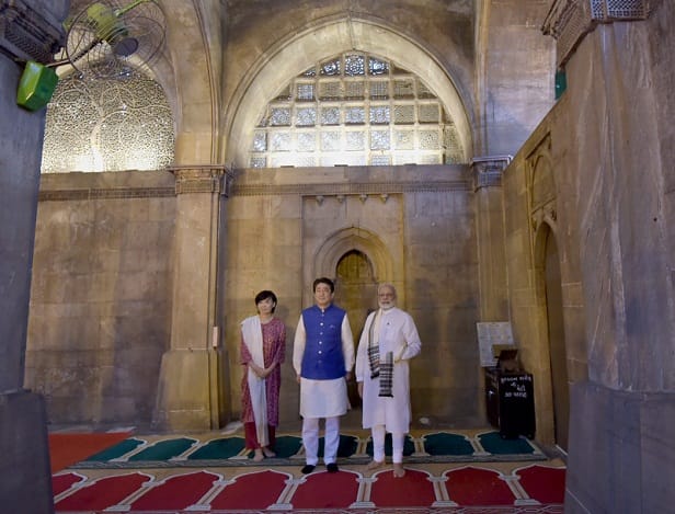 Prime Minister Modi accompanied by Mr Abe also reached the 500-year-old Siddi Saiyad Mosque situated near Lal Darwaja built by the erstwhile Sultanate of Gujarat. PM Modi guided his guests and showed them the popular Siddi Sayyaid ki Jaali, an excellent model of Indo-Saracenic architecture. The intricately carved stone window is part of a great attraction of the historic masjid. The site is known for its stone lattice work.