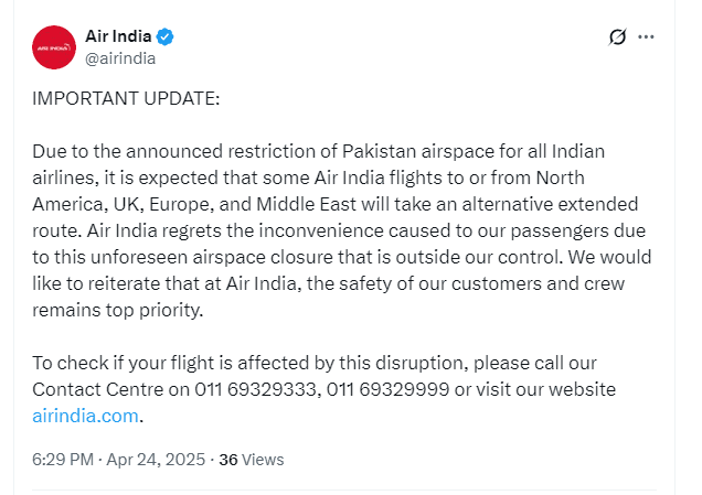 ائیر انڈیا نے رکاوٹوں کی تصدیق کے لیے پر جا کر مسافروں کو مطلع کیا کہ شمالی امریکہ، برطانیہ، یورپ اور مشرق وسطیٰ جانے اور جانے والی پروازیں اب توسیعی راستوں پر چلیں گی۔ IndiGo نے اپنے بیان میں، فضائی حدود کی بندش کی وجہ سے کچھ بین الاقوامی پروازوں کے نظام الاوقات پر پڑنے والے ممکنہ اثرات کو تسلیم کرتے ہوئے کہا کہ وہ تکلیف کو کم کرنے کے لیے کام کر رہے ہیں اور مسافروں کو مشورہ دے رہے ہیں کہ وہ اپنی پرواز کی حیثیت اور دوبارہ بکنگ کے اختیارات کو چیک کریں۔