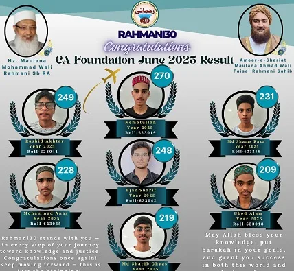 Congratulating the successful students, Hazrat Maulana Ahmad Wali Faisal Rahmani (Damat Barakatuhum), Sajjada Nashin of Khanqah Rahmani, Munger, and Ameer-e-Shariat, highlighted that the results are the outcome of “effort, sacrifice, and guidance.” He underscored that Rahmani30’s mission is to nurture a generation that embodies honesty, fairness, and social responsibility, while steering clear of exploitative financial practices such as interest and gambling, and instead promoting wealth circulation, accountability, and compassion.