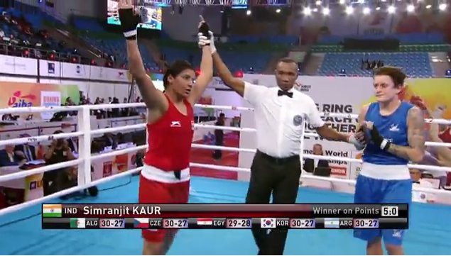 In the 64 Kg pre-quarters Simranjeet got yet another unanimous decision as she beat Megan Reid from Scotland. The debutant Punjab girl had an upper hand in all three rounds with an impressive display of attacking boxing.