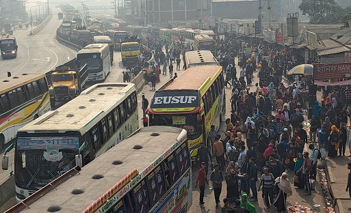 Bus terminals and railway stations across the capital were packed from Monday night, with garment workers leading the rush after factories in Gazipur, Tongi, Chowrasta, Konabari and Sreepur shut under a government directive to facilitate voting.