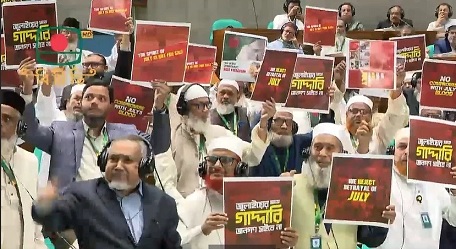 Tensions flared when the president arrived to deliver his constitutionally mandated speech. Opposition MPs protested with red cards reading “No betrayal with July” and placards saying “We want democracy, not fascism” and “No compromise with July blood.” Some Jamaat lawmakers also remained seated during the national anthem.