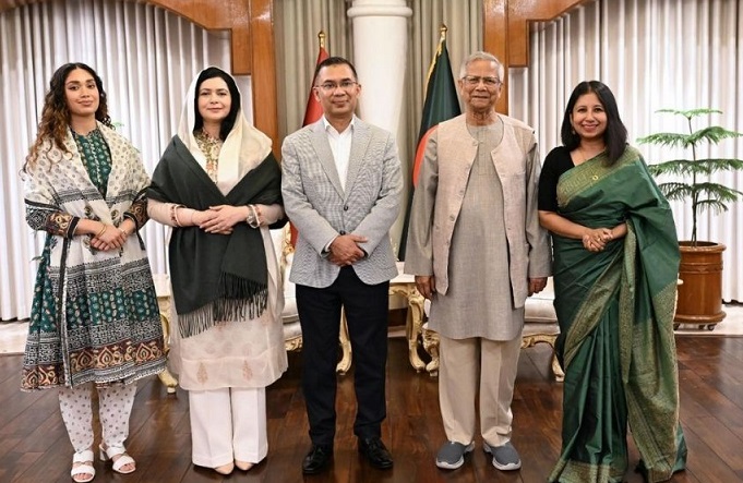 BNP Chairman Tarique Rahman, accompanied by his family members, paid a courtesy call on Bangladesh interim government Chief Adviser Muhammad Yunus on Thursday evening, marking his first formal meeting with the head of the interim government since its formation. The meeting took place at the State Guest House Jamuna around 7.30pm. Tarique Rahman was accompanied by his wife, Dr Zubaida Rahman, and daughter Barrister Zaima Rahman.