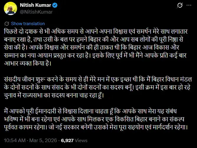 Political analysts say Nitish Kumar’s entry into the Rajya Sabha could mark the beginning of a new phase in Bihar politics. Having served as Chief Minister for nearly 20 years across different terms, his shift to the national stage would open the door for new leadership in the state.