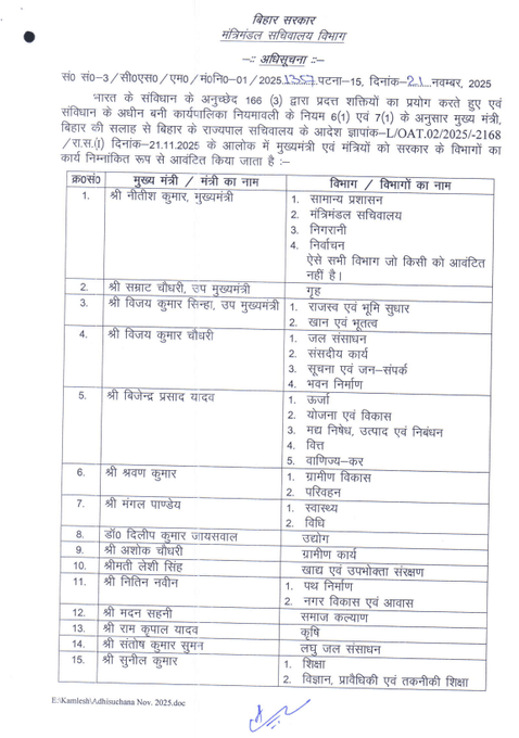 नीतीश कुमार ने सामान्य प्रशासन विभाग (GAD), कैबिनेट सचिवालय, सतर्कता, चुनाव और वे सभी विभाग अपने पास रखे हैं जिन्हें किसी मंत्री को आवंटित नहीं किया गया है। लेकिन गृह विभाग छोड़ना राजनीतिक रूप से एक बड़ा संदेश माना जा रहा है — बीजेपी अब बिहार सरकार में निर्णायक शक्ति केंद्र बनकर उभरी है, क्योंकि विधानसभा में उसके 89 विधायक हैं।