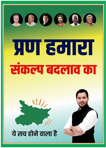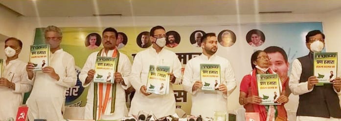 The grand alliance (Mahagathbandhan) comprising Rashtriya Janata Dal (RJD), Congress and Left parties today released their manifesto – Prann Hamara Sankalp Badlav Ka – for the upcoming Assembly elections in Bihar.