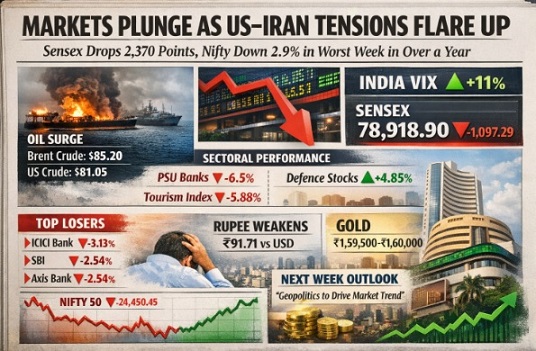 Indian equity markets witnessed a brutal sell-off this week, culminating in a “Black Friday” as escalating tensions in the US-Iran conflict sent shockwaves through global financial hubs. Benchmark indices recorded their most significant weekly decline in over 14 months, with the Nifty 50 plunging 2.9% and the Sensex eroding 2,370 points of investor wealth over the five-day period.