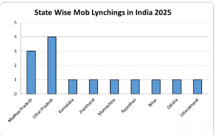 According to the data of CSSS, 2025 witnessed fourteen (14) mob lynching. The 14 incidents of mob lynching claimed eight lives – all Muslims. 14 were injured. Two triggers emerged as most prominent- cow vigilantism which works mostly as an extortion racket and allegations of “love jihad” or interfaith relationships. Other triggers included allegations of theft, suspicions of illegal immigration, raising alleged pro-Pakistan slogans and refusals to chant “Jai Shri Ram”.