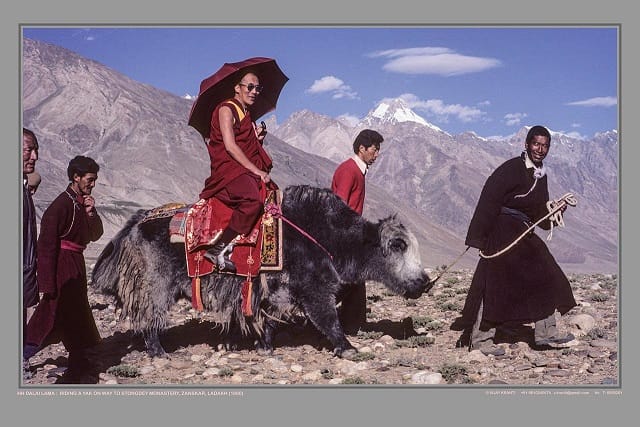 Yet another photo shows Dalai Lama receiving Guard of Honour from a contingent of soldiers of the Indo Tibetan Border Police near Leh. Vijay Kranti’s photos of Dalai Lama riding a yak in the Zanskar valley of Ladakh deeply engaged in reading a news magazine at his Dharamshala home. Vijay has got international acclaim for several of his historic pictures.