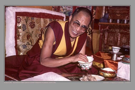 Another photo (Sep 1980) shows Dalai Lama enthusiastically playing on the traditional drums of a Beda family of Ladakh while Kushak Bakula Rinpoche, the top ranking Buddhist Guru of Ladakh and a large crowd of onlookers are watching him with awe. In Ladakh where the musician community of the Bedas has been suffering discrimination at the hands of the Buddhist clergy, Dalai Lama made it a point to visit a Beda family where he not only had food with the family and played on their drum, but also gave a stinging lecture to the Buddhist clergy about giving a respectable treatment to the Bedas.