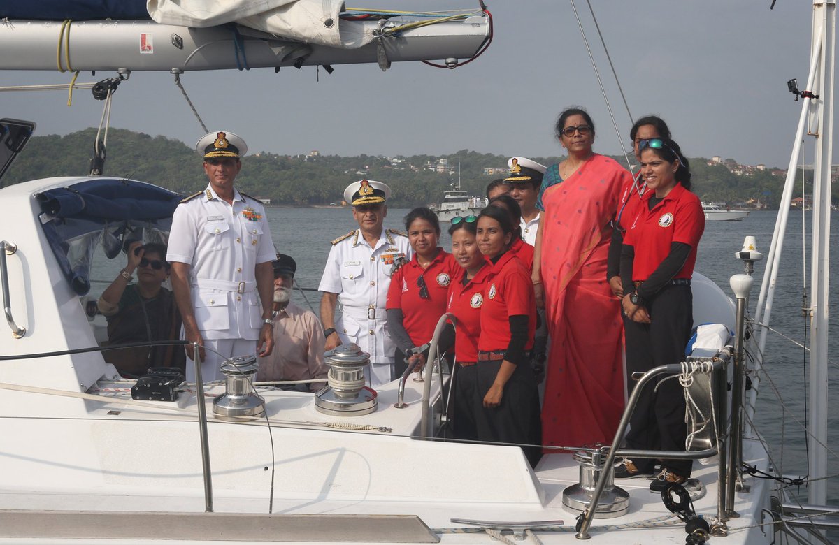 Defence minister Nirmala Sitharaman flagged-in, Indian naval sailing vessel Tarini (INSV Tarini) after it reached home with an all women crew, successfully completing the circumnavigation of the globe.