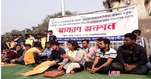 In a rare show of solidarity a group of Dhaka University students went on hunger strike today demanding postponement of the Dhaka City Corporation Mayoral elections scheduled for January 30 which is Saraswati Puja day in Bangladesh.