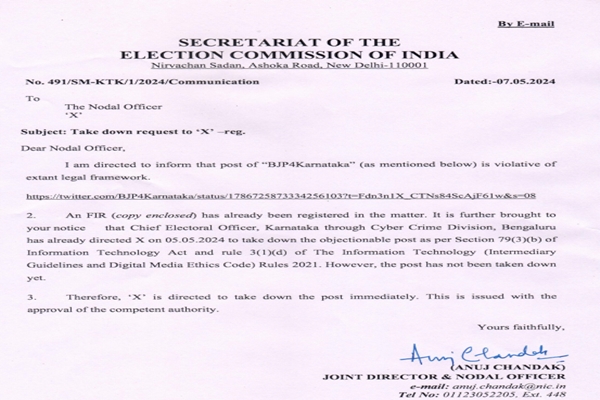 Election Commission has directed social media platform X to immediately take down an objectionable post made from the handle of Karnataka BJP. In a letter to the Nodal Officer of ‘X’, the Commission said, post by the Karnataka BJP is violative of extant legal framework. It said, an FIR has already been registered in the matter. In its letter, the Commission also highlighted the direction of Chief Electoral Officer of Karnataka to the social media platform X to remove the objectionable post.