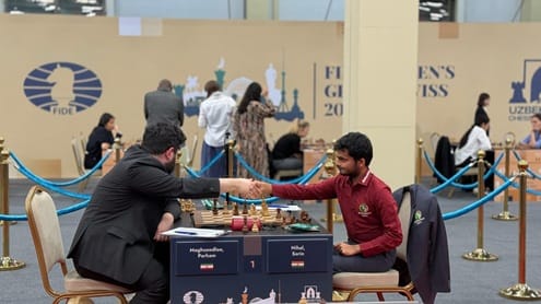 Indian Grandmaster Nihal Sarin delivered a standout performance at the FIDE Grand Swiss in Samarkand, Uzbekistan, defeating Iran’s Parham Maghsoodloo in a thrilling seventh-round encounter to move into joint first place. Sarin now shares the lead with German GM Matthias Bluebaum, who secured a crucial win over India’s Arjun Erigaisi. Both players sit atop the standings with 5.5 points.