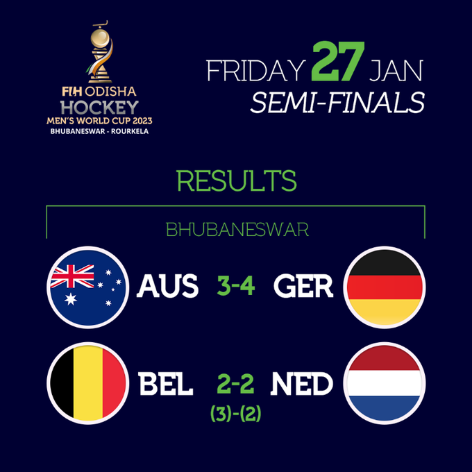 Bhubaneswar, 27 January : Defending champion Belgium overpowered the Netherlands 3-2 in dramatic shootout ,after playing 2-2 in regulation period to set up title clash with Germany who stunned Australia 4-3 in the Hockey World Cup here this evening.