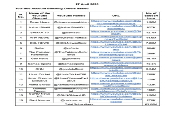 India has imposed ban on 16 Pakistani YouTube channels, including Dawn News, Samaa TV, Ary News and Geo News, for disseminating misinformation against India in the backdrop of the recent Pahalgam terror attack.