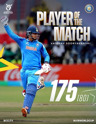 Suryavanshi also became the fastest Indian to score a century in U19 World Cup history, breaking the previous record held by Raj Angad Bawa, who had reached the milestone in 69 balls against Uganda in 2022. The 14-year-old batter further became the third Indian to score a century in a U19 World Cup final.