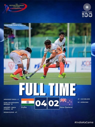 In the Sultan Johor Cup Junior Men’s Hockey 2025 in Johor Bahru, Malaysia, India today defeated New Zealand 4-2. For India, Arshdeep Singh, PB Sunil, Araijeet Singh Hundal and Roshan Kujur scored one goal each. New Zealand fought hard and pulled two goals back via captain Gus Nelson and Aiden Bax, but despite India being down to 10 men in the dying minutes, they held on for their second consecutive victory in the tournament.