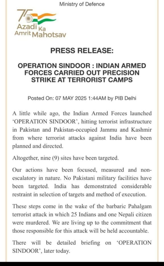 The government of India today said that its forces have launched “Operation Sindoor”, “hitting terrorist infrastructure” in Pakistan and Pakistan-administered Kashmir “from where terrorist attacks against India have been planned and directed”.