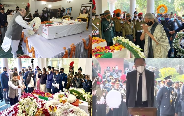 Chief Justice of India N. V. Ramana, National Security Adviser Ajit Doval, BJP President J. P. Nadda, Congress leader Rahul Gandhi, Members of Parliament, Chief Ministers of several states, Army Chief General Manoj Naravane, Air Chief Marshal Vivek Chaudhari, and Navy Chief Admiral R. Hari Kumar, several Officers of tri-services and foreign dignitaries also paid tributes to departed souls.