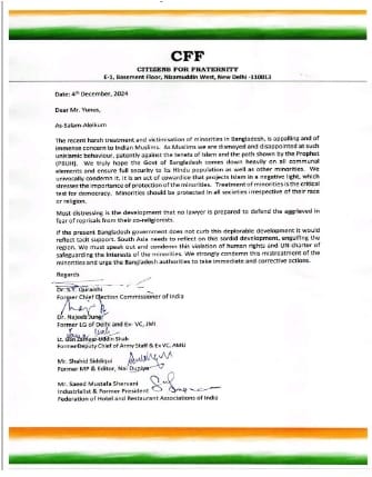 The group, under the banner of Citizens for Fraternity , expressed hope that the Bangladeshi authorities would ensure the safety of all minorities, particularly Hindus, and take swift action to restore communal harmony. “We strongly urge the government to uphold justice, human rights, and democratic values,” letters concluded. he This joint call to action highlights the pressing need for regional introspection and cooperation to address communal violence and protect minority communities.