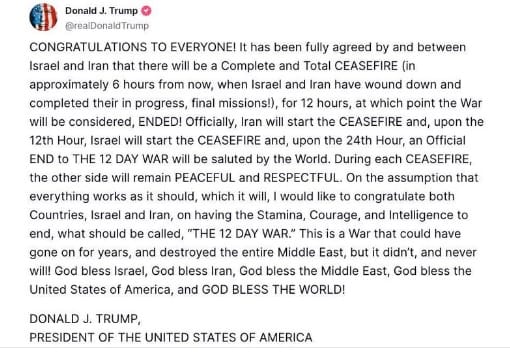 US President Donald Trump said the ceasefire between Israel and Iran is now in effect. “The ceasefire is now in effect. Please do not violate it!,” he posted on Truth Social.