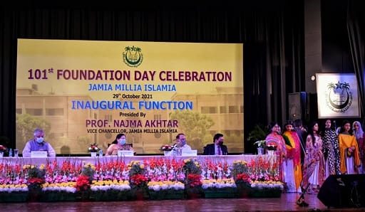 Jamia Millia Islamia (JMI) on Friday (Oct 29) completed 101 years of its establishment. The Foundation Day was celebrated with traditional gaiety and fanfare. Celebrations began with a Guard of Honour to the Vice Chancellor Prof. Najma Akhtar by NCC Cadets at the forecourt of Dr. M. A. Ansari Auditorium of the university. After the Guard of Honour the Vice Chancellor unfurled the Jamia Flag followed by the singing of song ‘Ye Jamia Ka Parcham..’ by students. All Covid-19 guidelines were followed during the programs.