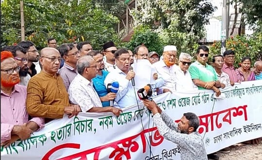 Key demands include implementation of the ninth wage board, a ‘No Wage Board, No Media’ policy, formation of a journalist protection law, two weekly holidays, and the repeal of all anti-media laws. Speakers — including DUJ President Shahidul Islam and Jatiya Press Club President Hasan Hafiz — also sought insurance, written contracts, fair pay for district correspondents, and an end to harassment and killings of journalists.