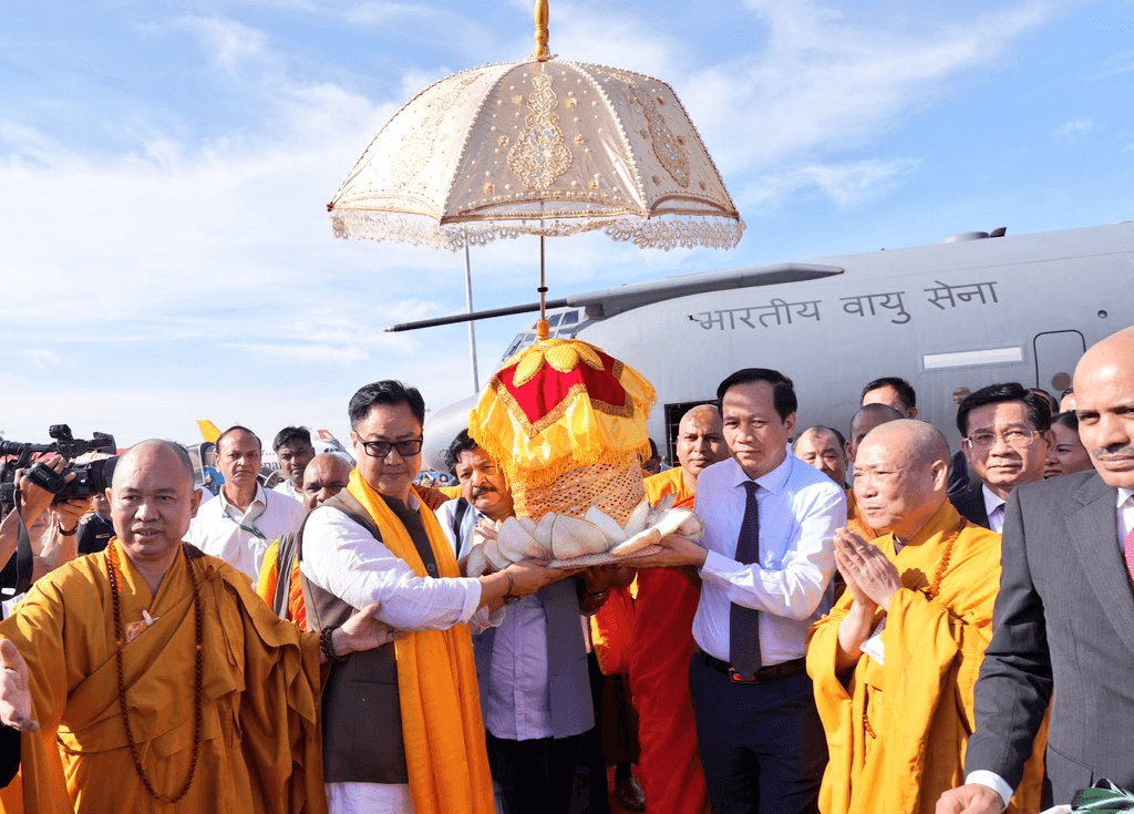 नई दिल्ली। केंद्रीय अल्पसंख्यक मामलों और संसदीय मामलों के मंत्री किरेन रिजिजू, आंध्र प्रदेश के पर्यटन और संस्कृति मंत्री कंडुला दुर्गेश, भारत के प्रतिष्ठित भिक्षुओं और वरिष्ठ अधिकारियों के साथ आज सुबह एक विशेष भारतीय विमान से भगवान बुद्ध के सारनाथ में रखे संग्राहलय के पवित्र अवशेषों को लेकर हो ची मिन्ह सिटी पहुंचे। यह यात्रा 6 से 8 मई तक वियतनाम द्वारा आयोजित किए जा रहे संयुक्त राष्ट्र वेसाक दिवस समारोह के संदर्भ में हो रही है। पवित्र अवशेषों की वियतनाम यात्रा तथा अन्य संबंधित गतिविधियां भारत और वियतनाम के बीच के घनिष्ठ संबंधों को और अधिक प्रगाढ़ बनाएंगी।