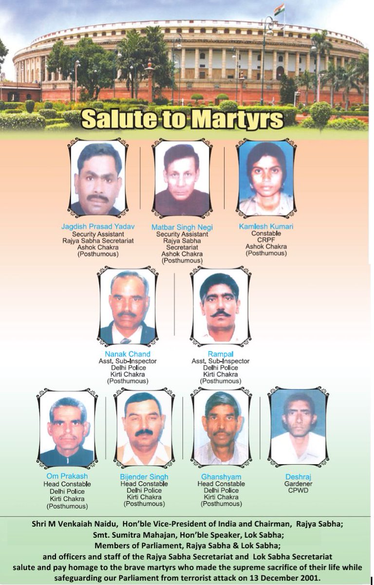 On this day, two persons from the Parliament Security Service of the Rajya Sabha, five Delhi Police Personnel and a woman constable of the Central Reserve Police Force, laid down their lives while preventing entry of terrorists inside the Parliament House Building. A gardener of CPWD had also lost his life in the attack.