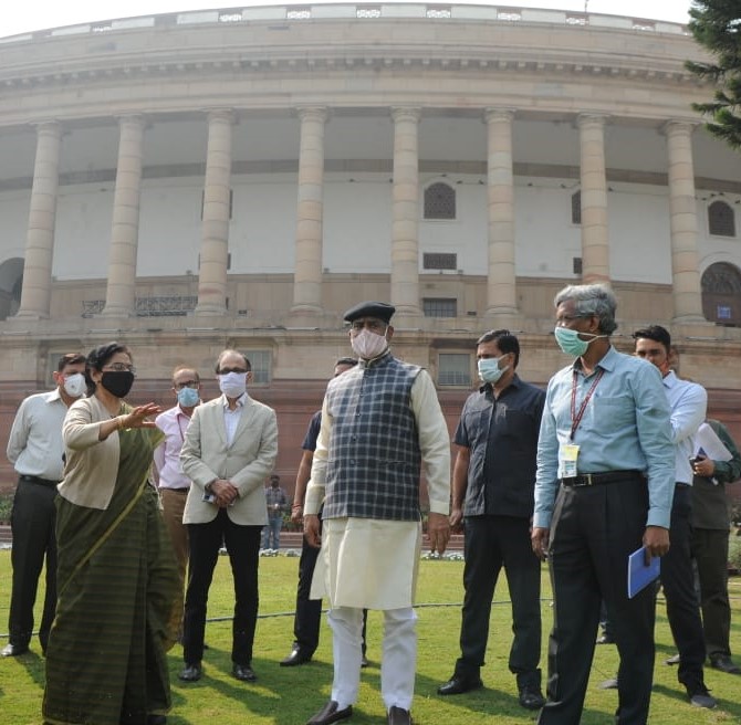 Lok Sabha Speaker Mr Om Birla on Saturday conducted an on-site review of the ongoing construction work for the new Parliament House Building.