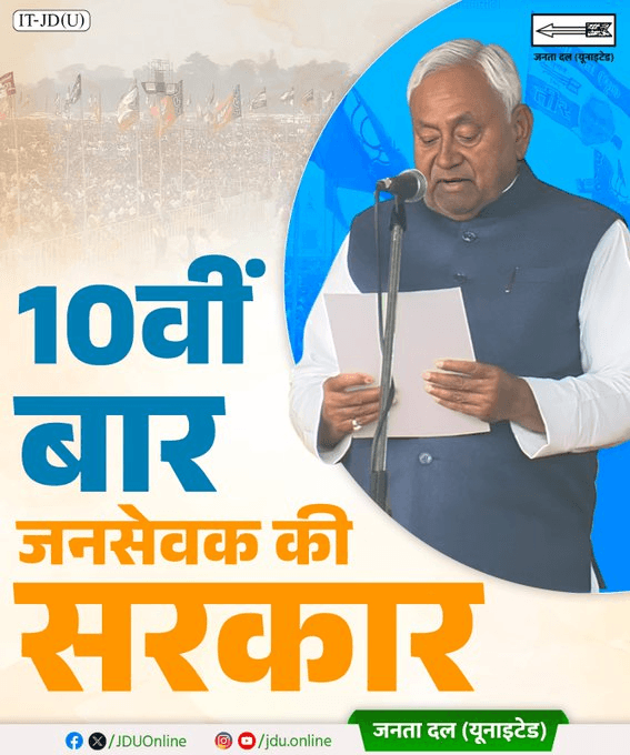بہار کی سیاست میں جمعرات کا دن ایک تاریخی سنگِ میل ثابت ہوا، جب نتیش کمار نے ریکارڈ دسویں مرتبہ وزیرِ اعلیٰ کے عہدے کا حلف اٹھایا۔ پٹنہ کے تاریخی گاندھی میدان میں منعقد ہونے والی اس پُروقار تقریب میں وزیرِ اعظم نریندر مودی، مرکزی وزیرِ داخلہ امت شاہ, بی جے پی کے قومی صدر جے پی نڈا, متعدد مرکزی وزراء اور این ڈی اے کی حکومت والی ریاستوں کے وزرائے اعلیٰ نے شرکت کی۔ تقریب نے حکمران اتحاد این ڈی اے کی مضبوطی اور سیاسی استحکام کا واضح پیغام دیا۔