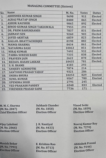 In the elections for the 16-member Managing Committee, Niraj Kumar topped the list with 932 votes, followed by Abhishek Kumar Singh (911), Jahanvi Sen (903), Ashok Kaushik (892), Kallol Bhattacharjee (882), Praveen Jain (878), Agraj Pratap Singh (865), Manoj Sharma (861), Nyanima Basu (851), PB Suresh (838), VP Pandey (833), Prem Bahukhandi (831), Sneha Bhura (829), Javed Akhtar (823), Rezaul Hasan Laskar (781), and Sunil Kumar (780).
