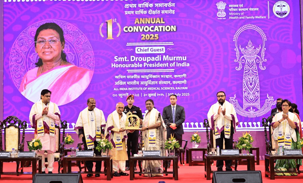 President Droupadi Murmu attended the inaugural convocation ceremony of AIIMS Kalyani on Wednesday, July 30, 2025, delivering a powerful address to graduating medical students and faculty. She emphasized the critical role doctors play in nation-building and the importance of service, responsibility, and continuous learning.