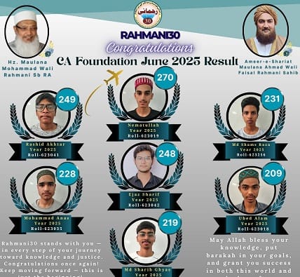 Congratulating the successful students, Hazrat Maulana Ahmad Wali Faisal Rahmani (Damat Barakatuhum), Sajjada Nashin of Khanqah Rahmani, Munger, and Ameer-e-Shariat, highlighted that the results are the outcome of “effort, sacrifice, and guidance.” He underscored that Rahmani30’s mission is to nurture a generation that embodies honesty, fairness, and social responsibility, while steering clear of exploitative financial practices such as interest and gambling, and instead promoting wealth circulation, accountability, and compassion.