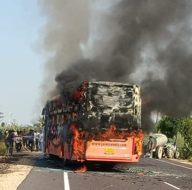 At least 10 people are feared dead, and over 14 others sustained critical burn injuries when a private bus caught fire near the Thaiyat area on the Jodhpur Highway in Rajasthan this evening.