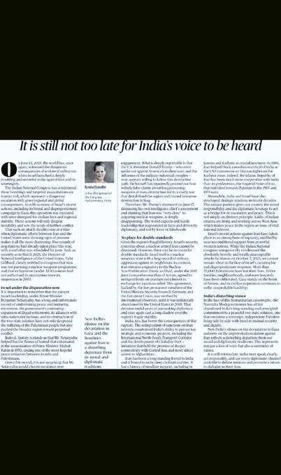 In a sharply-worded opinion piece published in The Hindu, titled “It is still not too late for India’s voice to be heard”, Gandhi lamented that India has abandoned its long-held position advocating for a peaceful two-state solution—one that envisions an independent Palestine coexisting with Israel.