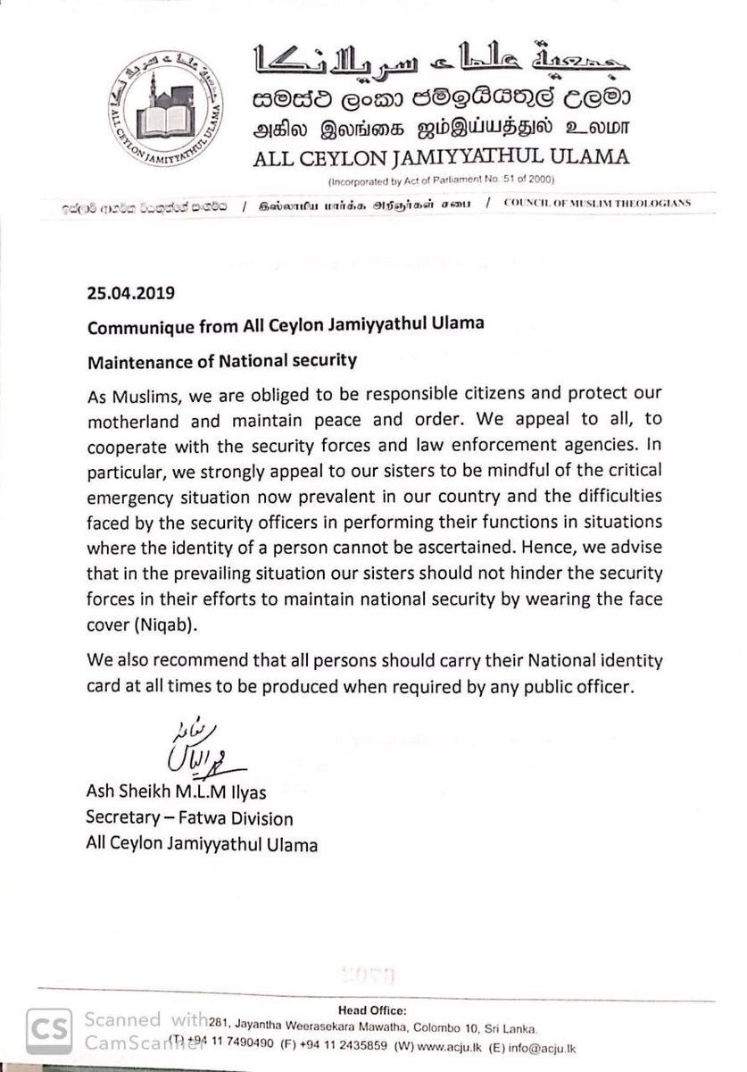Meanwhile All Ceylon Jamiyyahul Ualama has appealed Muslim women not to wear Niqab (face cover) to maintain national security…..