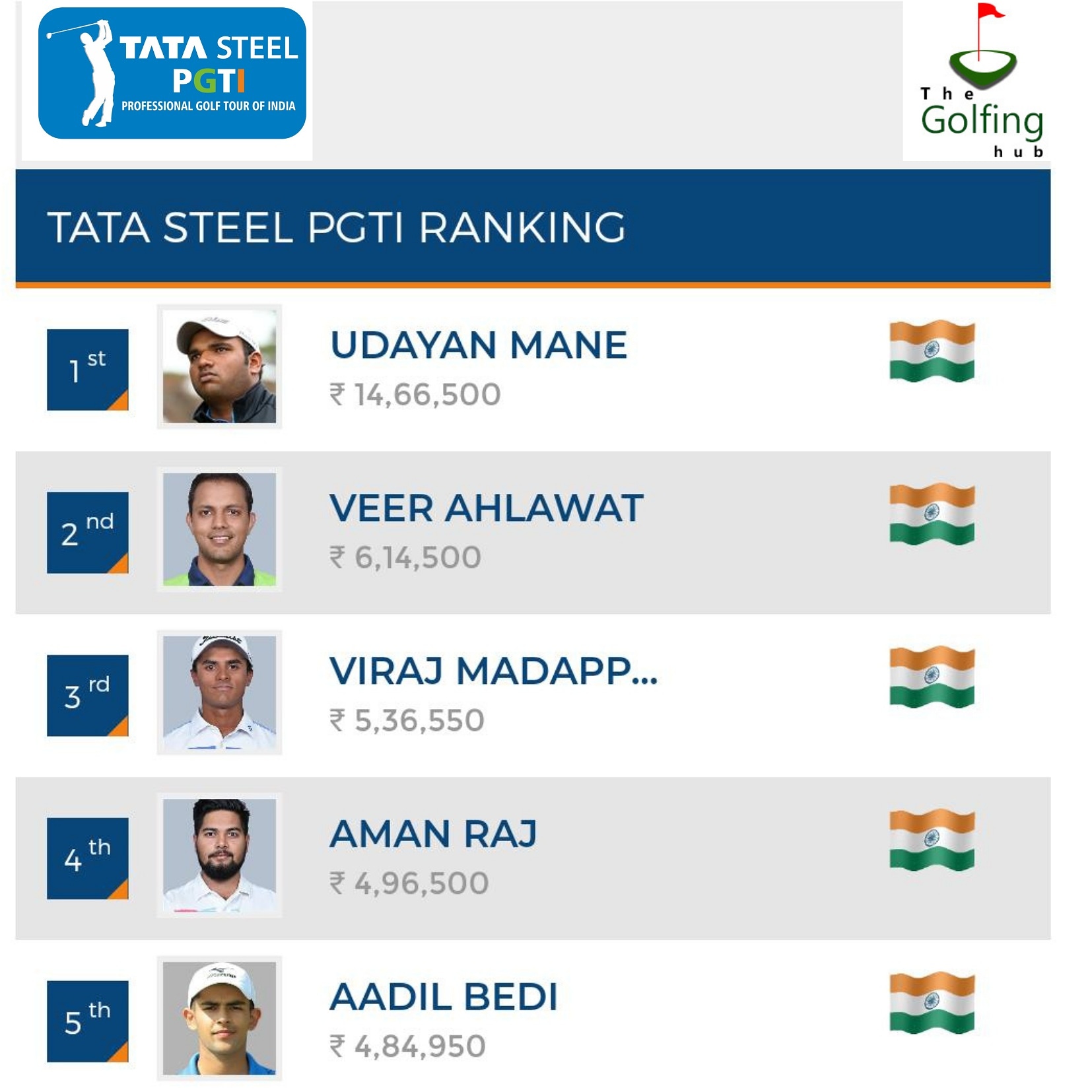 Interestingly, youngsters dominate the rankings with 29-year-old Udayan Mane leading with season’s earnings of Rs. 14,66,500. The Pune-based Mane won the first two events of the season back in February. The next four on the rankings – Veer Ahlawat, Viraj Madappa, Aman Raj and Aadil Bedi – are all 25 years and below in age. Aadil Bedi won the last event held in March this year after a record six-hole playoff victory against Udayan Mane.