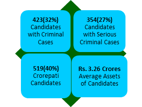 • Candidates with Serious Criminal Cases: 354(27%) have declared serious criminal cases against themselves.